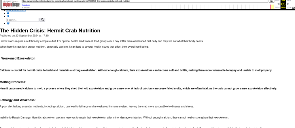 Though that page is no longer available, you may still view the content here and is used as a comparison source for the next set of photographs: http://web.archive.org/web/20250105074324/https://www.landhermitcrabeducenter.com/blog/hermit-crab-nutrition-safe-list/2050849_the-hidden-crisis-hermit-crab-nutrition