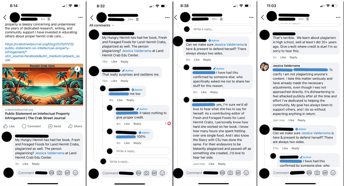 On January 10, 2025, The Crab Street Journal published its article “Public Statement on Intellectual Property Infringement”, noting simply that “original content…has been plagiarized by a Facebook group administrator and a related website.” It may be viewed in its entirety here: https://crabstreetjournal.org/blog/2025/01/10/public-statement-on-intellectual-property-infringement/