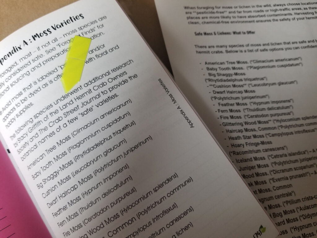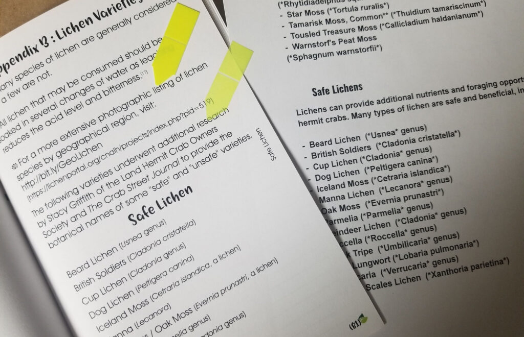 The moss and lichen varieties as seen in Appendix B of the “Fresh & Foraged Foods for Land Hermit Crabs” book were provided in an unpublished document by Stacy Griffith, a Contributing Editor, to its author for further research – hence the inline referencing as to the source of the information.