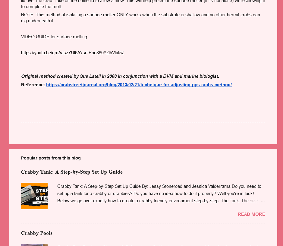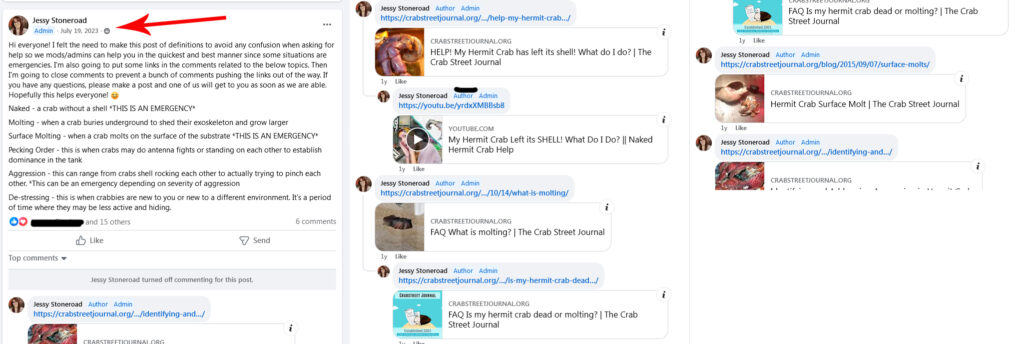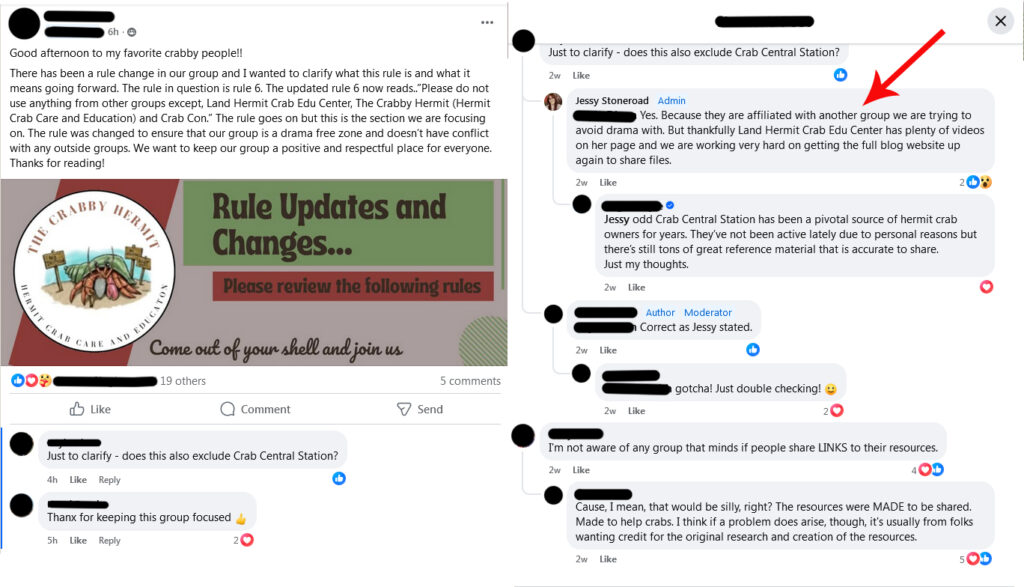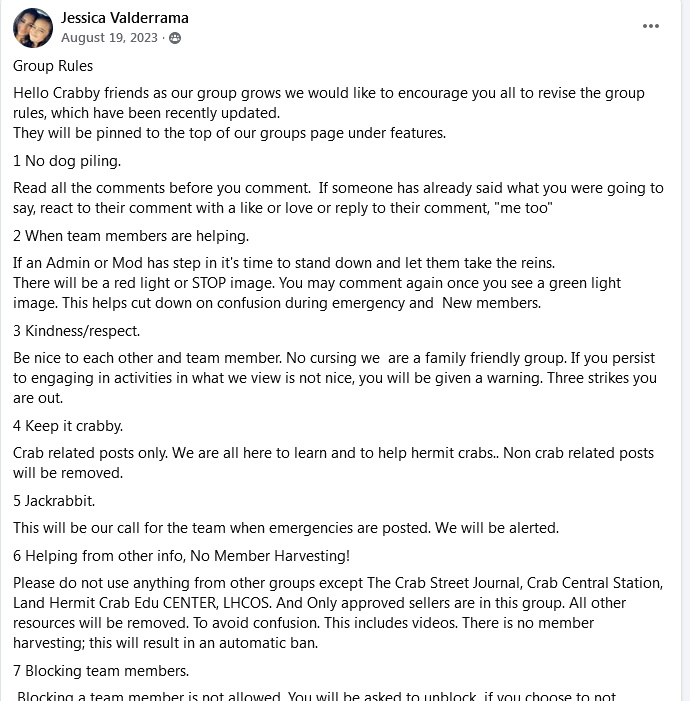 * Following the creation of the Land Hermit Crab Edu Center’s files, Jessica Valderrama began linking to those versus the original Crab Street Journal articles. With regard to care files, the other admins and moderators continued linking to Crab Street Journal sources. One instance of commenting is provided below, added 2.12.2025, to clarify that the scope of this site is focused solely on the behaviors of Jessica Valderrama at this time.