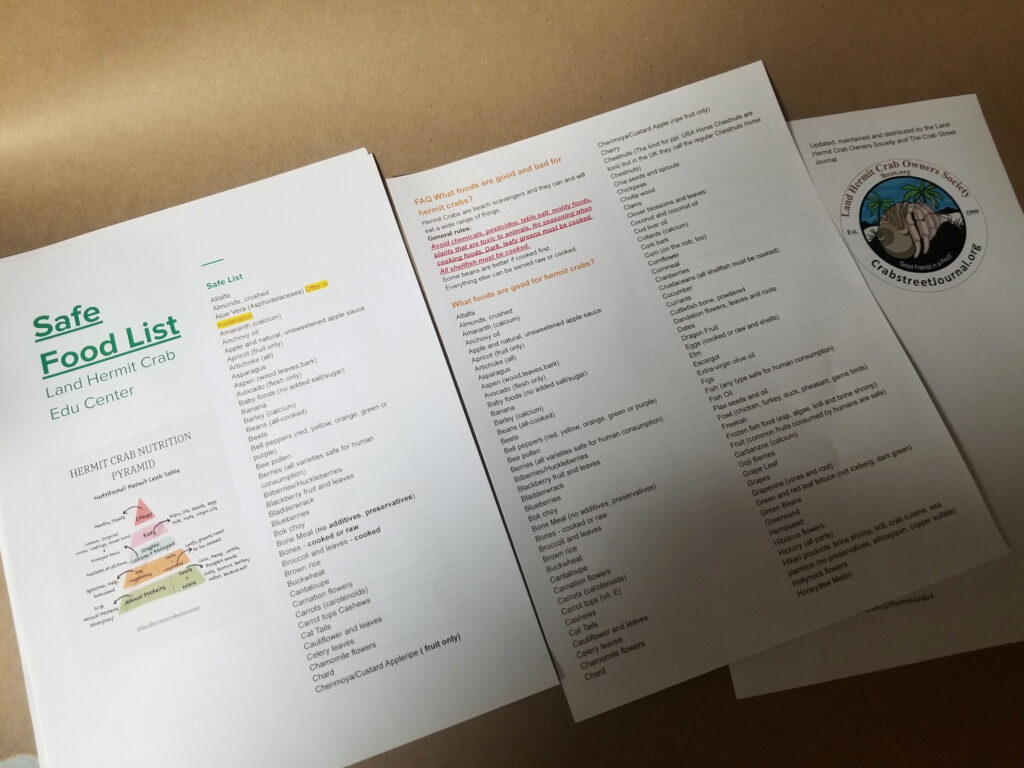 The Safe List, downloaded from the Crabby Hermit Facebook Group Files and the “Printable Guides” of the landhermitcrabeducenter.com and land-hermit-crab-edu-center.com sites, as well as viewable in the past from within the blog post is compared to the file as currently available, accessible, and free for personal use from The Crab Street Journal, “What’s for dinner? A hermit crab food guide!” article at https://crabstreetjournal.org/blog/2016/04/22/hermit-crab-food-guide/ * and https://docs.google.com/document/d/113toruv4u7NJxPYdM8-xVXZ7W4duiC54EvKqrh33-pY/edit?usp=sharing