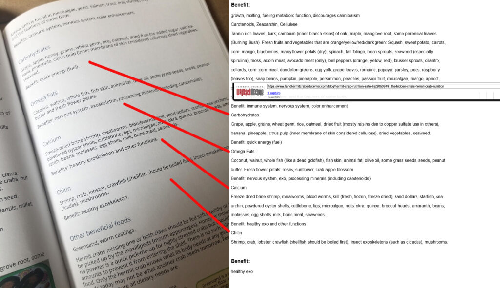 Top: Referenced page from “The Complete Guide…” book, page 80, highlighting one instance. Bottom: The first page of the Land Hermit Crab Edu Center’s “Safe Food List” versus the LHCOS/Crab Street Journal publication.